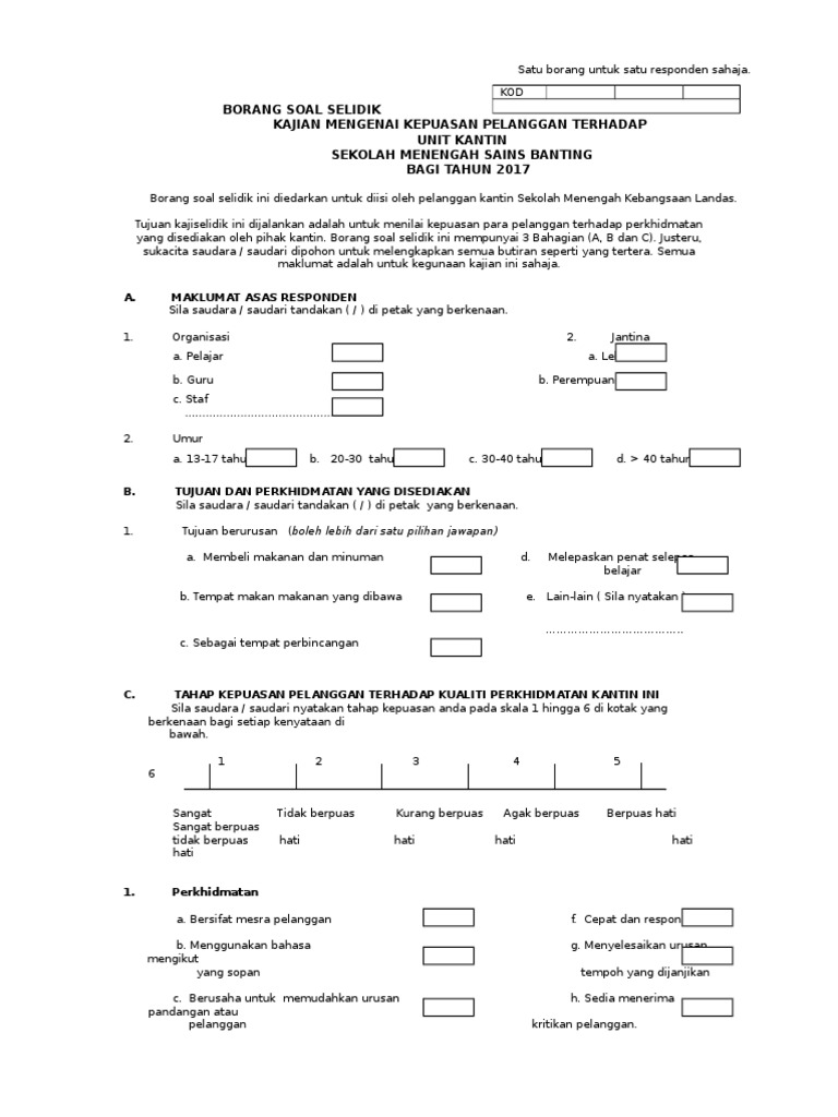 Borang Kaji Selidik Kepuasan Pelanggan - Oleh ilmu ekonomi id posting komentar.. Sila baca kenyataan yang diberikan. Borang kaji selidik akan digunakan sebagai instrumen untuk mendapatkan data kajian. Soal selidik ini bertujuan untuk mengenalpasti kepuasan diri pelajar di fakulti pendidikan (fp). Strategi meningkatkan kepuasan pelanggan merupakan cara yang untuk memperoleh pelanggan baru dengan mengabungkan berbagai cara. Air memainkan peranan terpenting bagi mengawal kestabilan tubuh badan dan pengambilan yang mencukupi menjadi asas dalam penjagaan kesihatan anda.