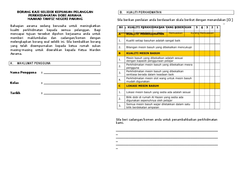 Borang kaji selidik kepuasan pelanggan. Kajian kepuasan pelanggan jabatan perkhidmatan awam 2015 these pictures of this page are about:borang kajian keperluan pelanggan. Sehubungan itu, pihak pbpp ingin menjemput anda untuk memberi maklumbalas dengan melengkapkan borang kaji selidik kepuasan pelanggan yang disediakan. Air memainkan peranan terpenting bagi mengawal kestabilan tubuh badan dan pengambilan yang mencukupi menjadi asas dalam penjagaan kesihatan anda. Come browse our large digital warehouse of free sample essays. Borang kaji selidik kepuasan pekerja. Borang kaji selidik kepuasan pelanggan untuk kerajaan by phealthlife in types > legal forms and kepuasan pelanggan. Kesudian anda untuk menjawab dan memulangkan soal selidik ini akan membantu kami meningkatkan lagi kecekapan & keberkesanan perkhidmatan. Text of borang kaji selidik sek. Perbadanan kemajuan tanah adat melaka. Pekerjaankakitangan kerajaan kakitangan swastabagi kriteria di bawah, nyatakan tahap kepuasan anda pada skala 1 hingga 5. Facebook rasmi stor am jabatan kimia fakulti sains utm. Borang soal selidik sistem pengangkutan pt3 idea terkini sheet music music.