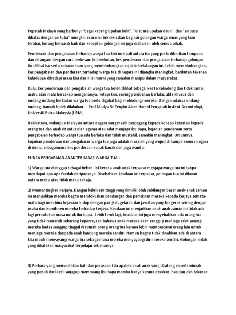 Jika sebuah pernikahan tak bisa lagi dipertahankan, maka jalan terakhir adalah dengan bercerai. Seseorang yang menderita kelalaian emosional saat kecil mungkin tidak mengerti bagaimana cara mengasuh anak. Come browse our large digital warehouse of free sample essays. Warga emas, iaitu pengabaian, pemulauan, penderaan seksual, dan pengabaian diri. Soalan 3 masalah pengabaian terhadap warga tua perlu diatasi.